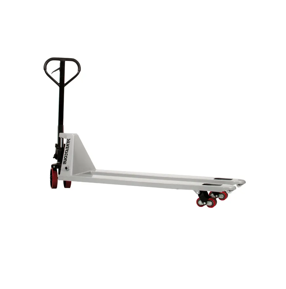 Underhållsfri gaffelvagn med slitstarkt chassi för tuff och tung hantering. Normal lyftfunktion för lätt lyftning av tunga laster. Inbyggd överlastventil och underhållsfria bussningar. Lyfthastighet 7 mm/slag. 5 års garanti på pumpen.